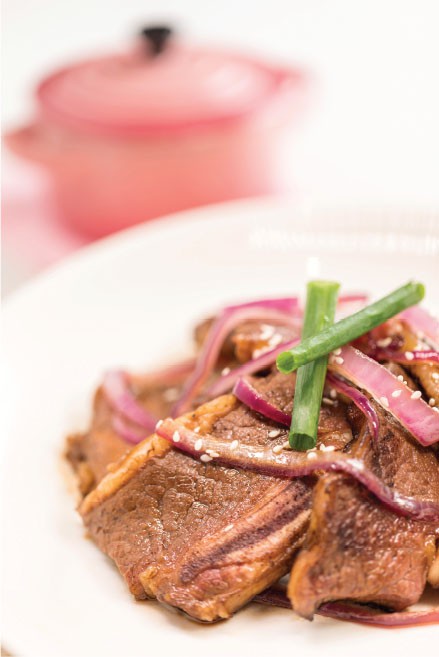 牛仔骨洗淨,切開3分;紫洋蔥切片